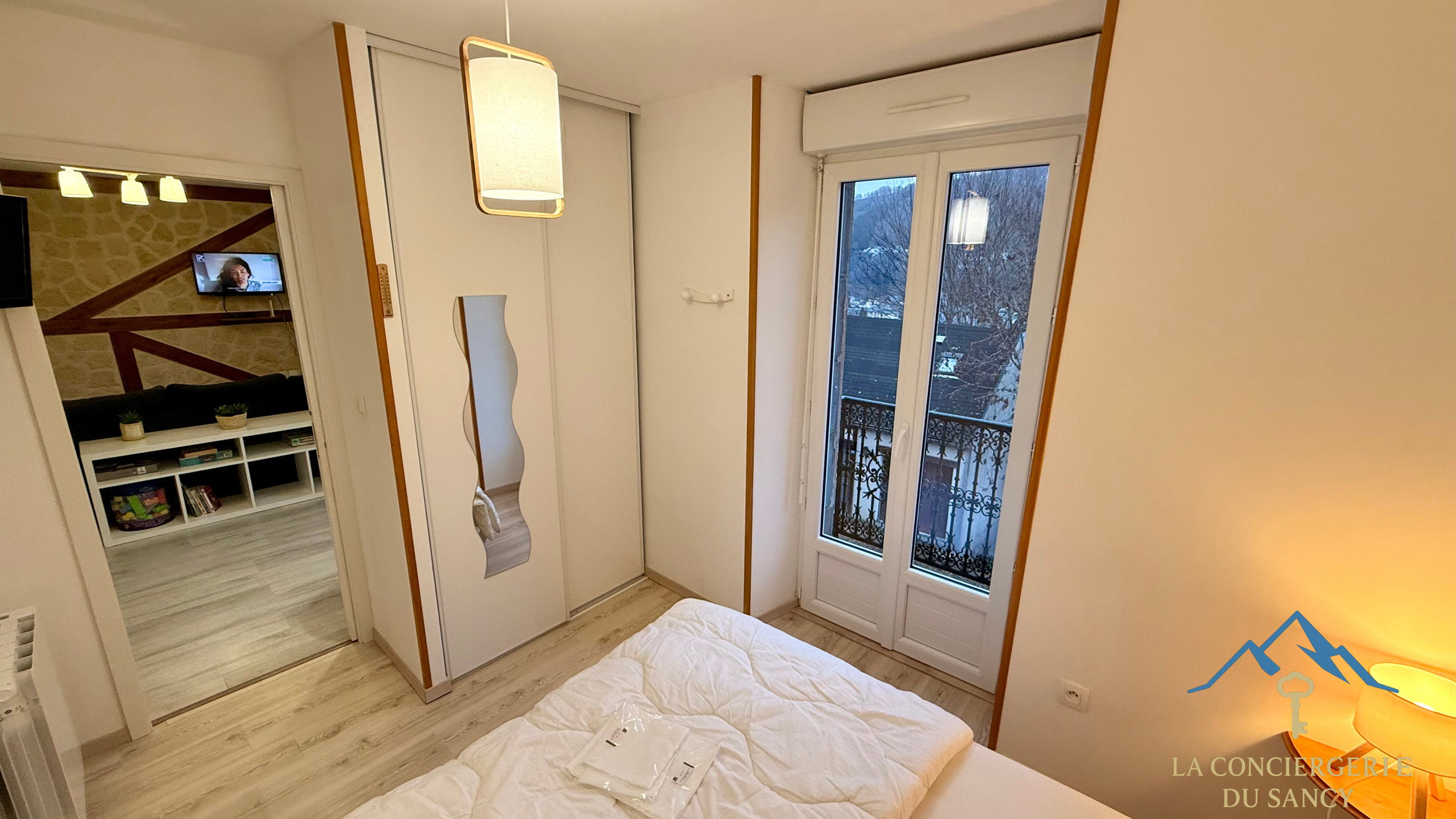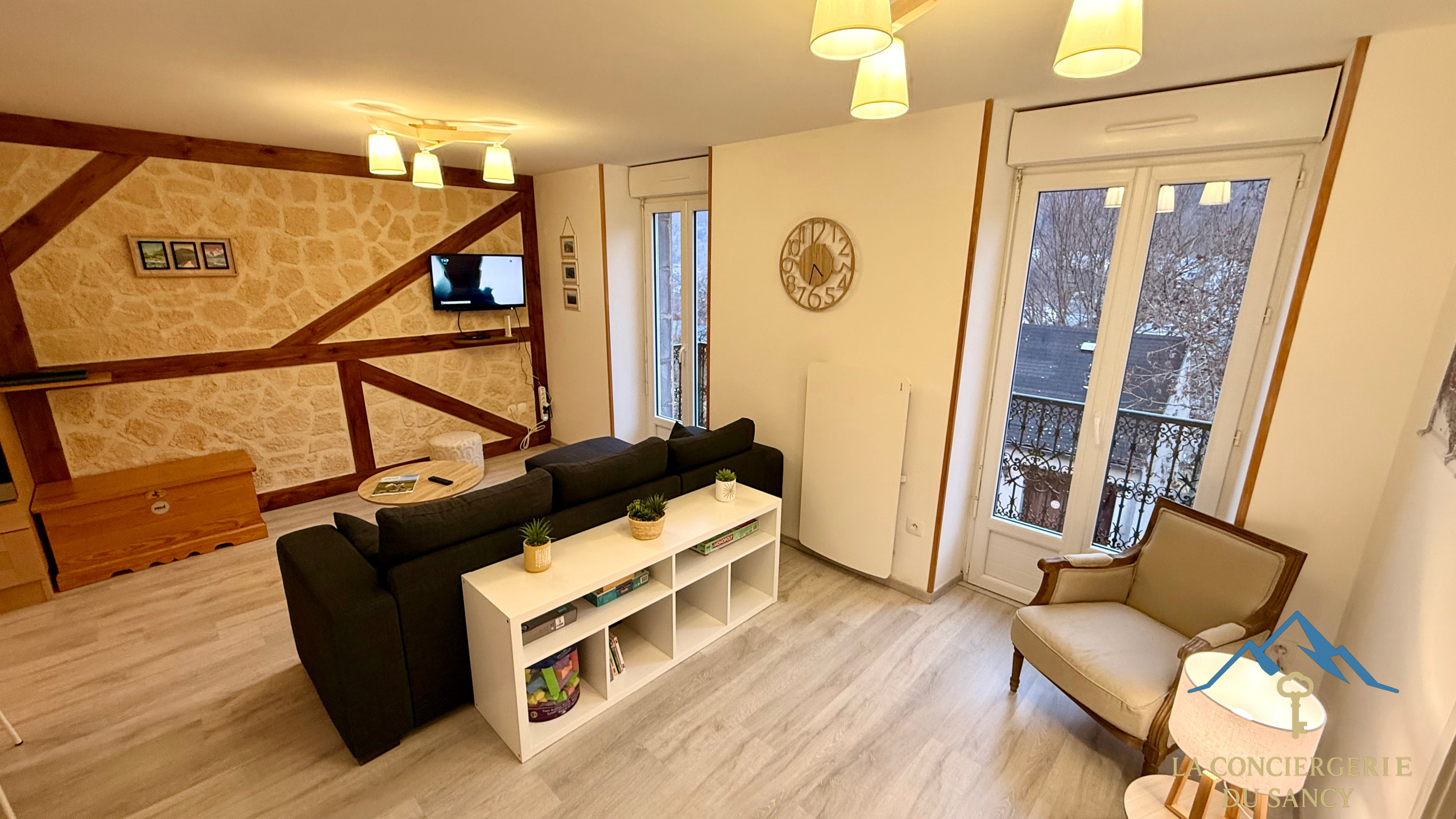 🛋 Le salon cosy est doté d’une télévision, idéal pour vos moments de détente après une journée en montagne ou aux thermes ainsi qu'un petit balcon