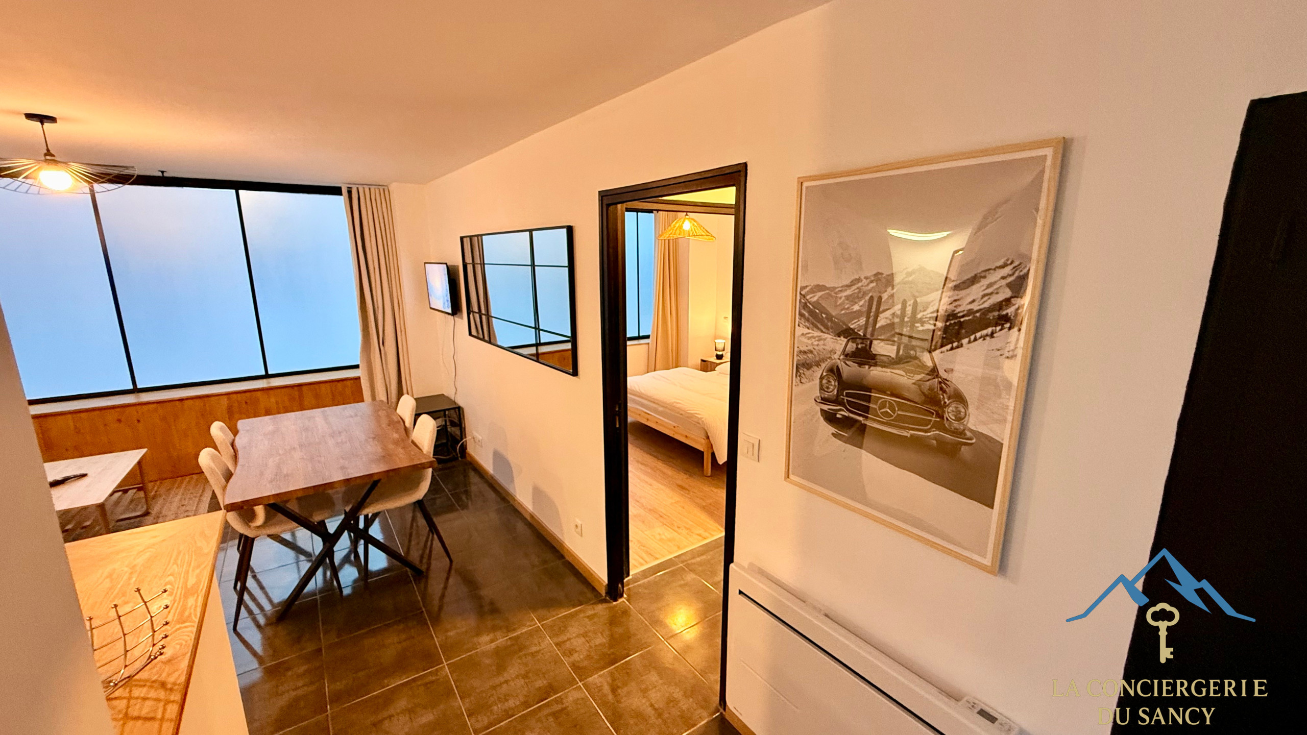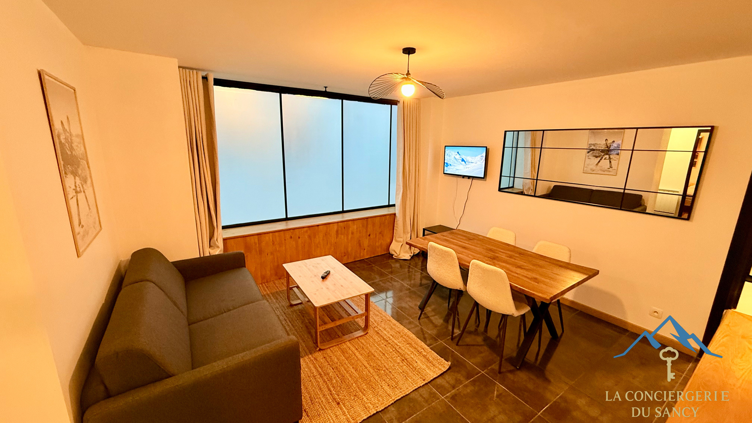 🛋 Le salon cosy est doté d’une télévision, idéal pour vos moments de détente après une journée en montagne ou aux thermes ainsi qu'un petit balcon